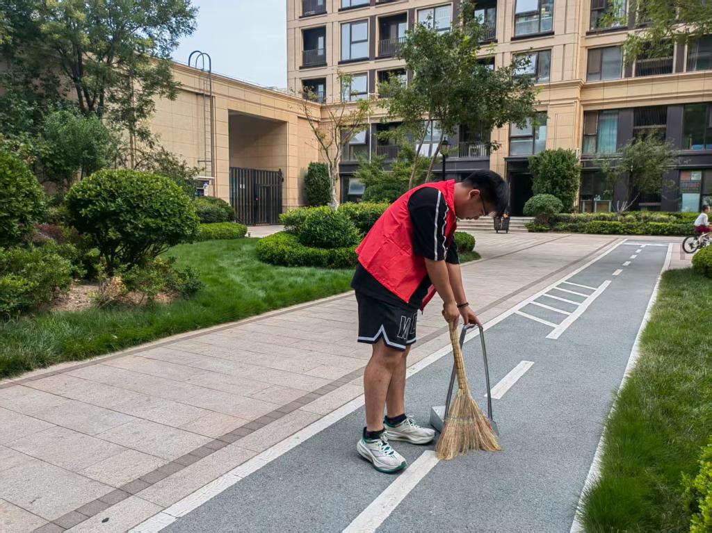 在社区公共区域,队员们首先清理主干道及人行便道,扫除路面上散落的各类垃圾,并使用垃圾钳清理绿化带内的积存杂物,特别是儿童游乐区周边地带。之后,对健身器材和儿童游乐设施进行清扫与擦拭消毒,重点处理高频接触部位。金属部件在消毒后及时用干布擦拭。