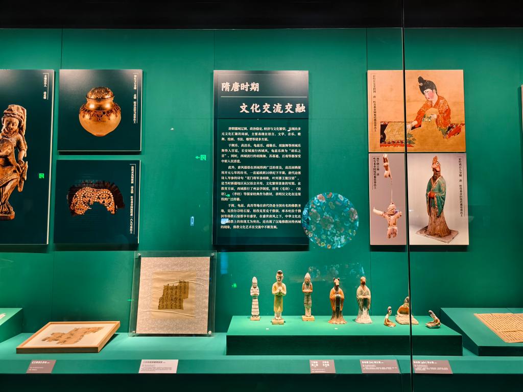 在魏晋南北朝展区,一组鲜卑族鎏金铜饰与汉式铜镜的并置陈列引人深思。实践队员注意到,铜饰上的卷草纹既保留了游牧民族的艺术特征,又融入了中原地区的纹样元素。唐代展区的三彩骆驼俑更是生动写照 —— 骆驼背上的西域乐师俑身着胡服,演奏的却是中原流行的乐器,再现了丝绸之路繁盛时期“胡汉一家”的鲜活场景。