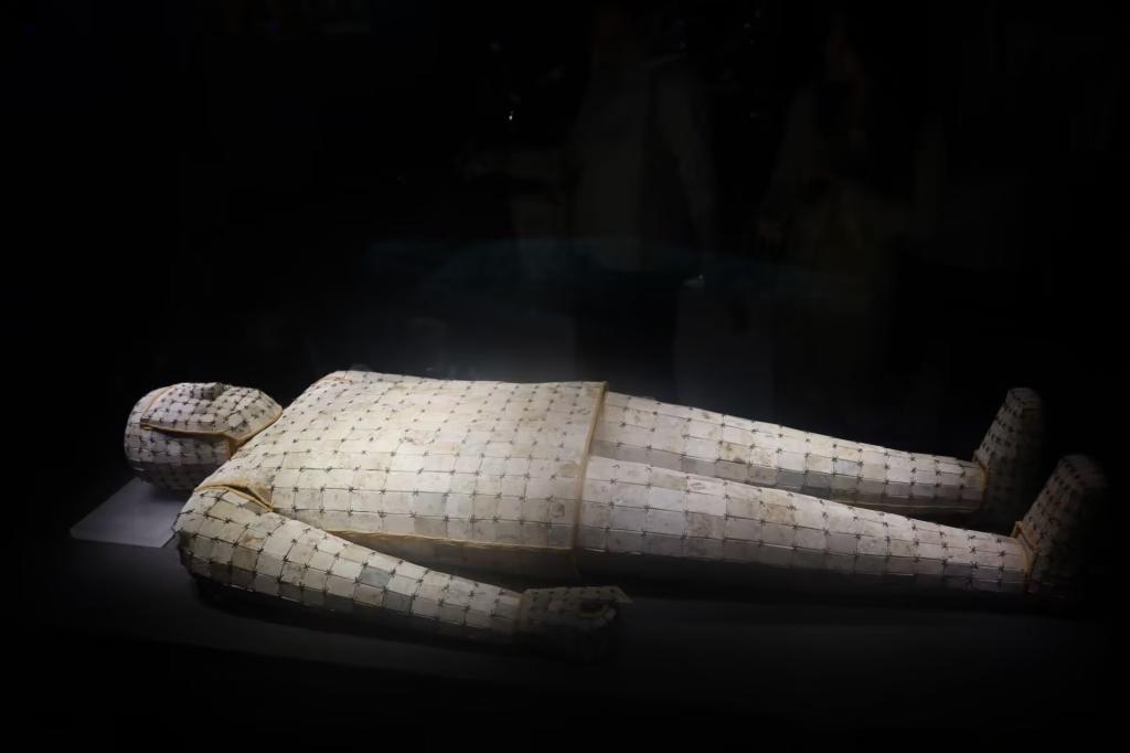 随着参观的深入,汉代文物展区成为全场焦点。当那具静静陈列在恒温展柜中的金缕玉衣映入眼帘时,实践队员们不约而同地发出惊叹。这件由两千多片和田白玉精心打磨、以金丝串联而成的殓服,长约1.8米,从头部的玉罩到脚部的玉靴一气呵成,每一片玉片边缘都钻有细小的孔眼,金丝穿过时严丝合缝。“这是1994年在徐州狮子山楚王陵出土的楚王刘戊的殓服,”指导老师讲解道,“当时出土时,虽然部分金丝被盗墓者抽走,但玉片的排列顺序依然清晰。古人相信‘金玉在九窍,则死人为之不朽’,金缕玉衣不仅是身份的象征,更承载着古人对生命延续的美好向往。”实践队员们仔细记录下玉片上细腻的云纹以及金丝的粗细——那不足0.1毫米的金丝,是用纯金反复捶打、抽拉而成,在没有现代工具辅助的汉代,这样的工艺足以让今人为之震撼。