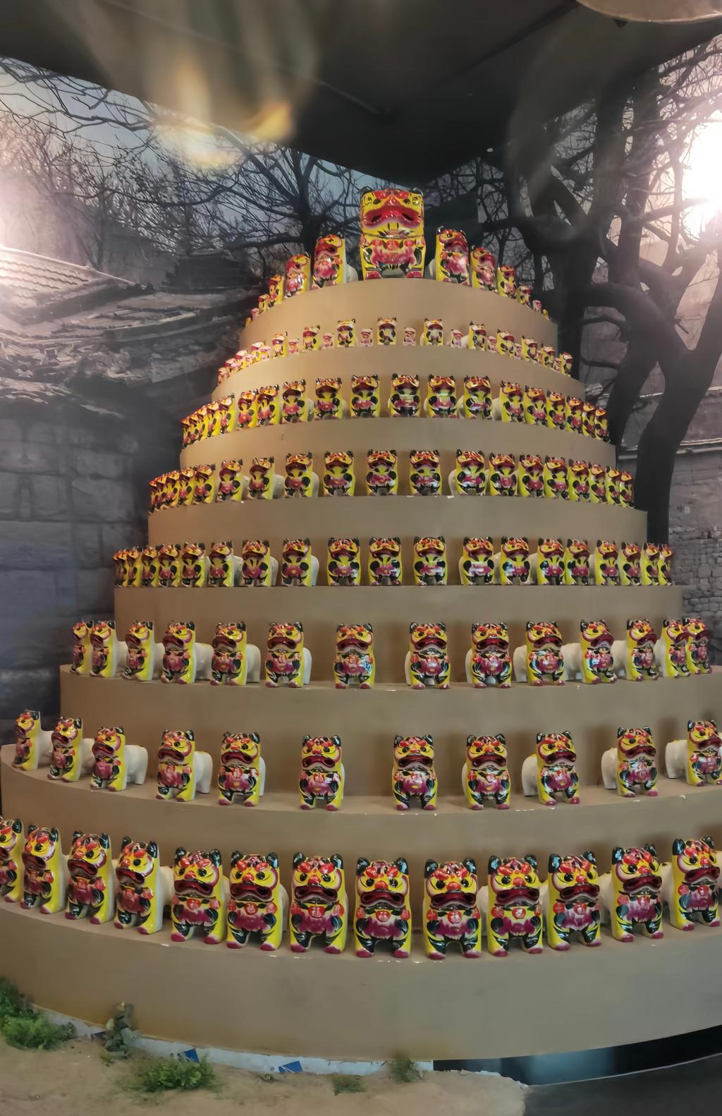 最引人注目的是“百虎展墙”,上百只形态各异的泥老虎整齐排列:有的昂首怒吼,威风凛凛;有的眯眼憨笑,俏皮可爱;还有的背上骑着胖娃娃,寓意“吉祥添丁”。讲解员介绍,泥老虎不仅是泥塑的代表作,更藏着独特的“声形密码”——内部的哨子结构能发出清脆声响,红、黄、绿为主的鲜艳色彩则源自民间对“喜庆”“活力”的直观表达。