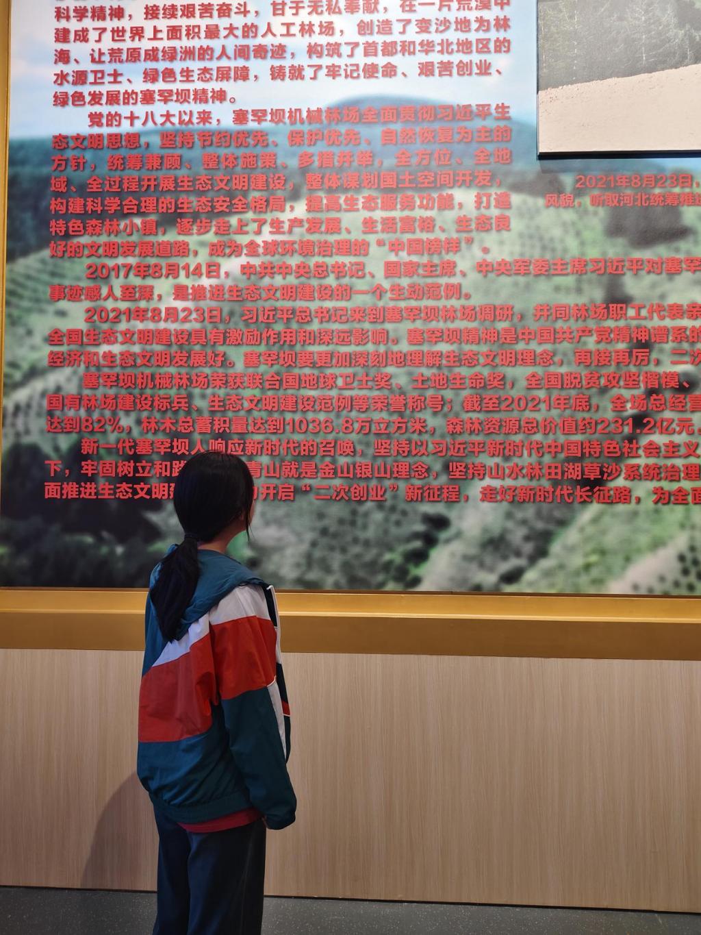 在展览馆的休息区,实践队随机采访了几位游客。来自北京的退休教师陈阿姨正带着孙女参观,她指向展柜里的老照片,向实践队队员讲述自己的父亲曾是塞罕坝的建设者,父亲常说塞罕坝的每棵树都承载着一段故事。如今带孩子来到这里,就是想让孩子明白,幸福生活并非凭空而来,而是一代代人辛勤付出、接力奋斗的成果。一位正在做生态保护课题的大学生也分享了自己的感受,他认为塞罕坝从 “一棵松” 到 “一片海” 的巨大蜕变,充分证明了 “人定胜天” 的真谛在于脚踏实地的行动,这种精神对当代大学生参与生态建设有着深刻的启发意义。