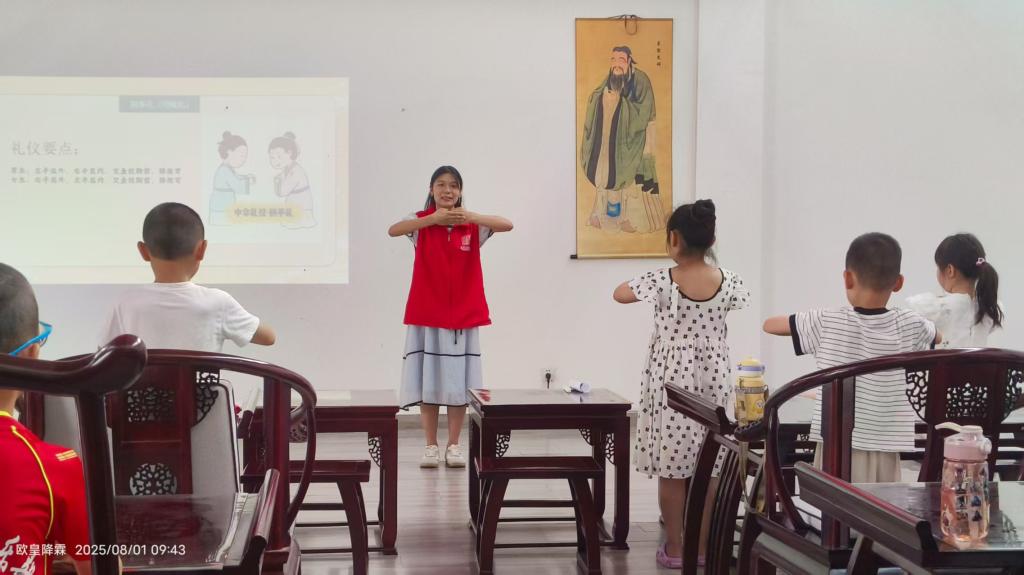 在“国学礼仪小课堂”环节,实践队员系统讲解并示范拱手礼、捧书礼等传统礼仪。针对不同性别礼仪细节差异,明确“男生左手在外、女生右手在外”的拱手礼规范,强调“拇指托书脊、身体坐正”的捧书礼要点,通过视频演示、逐一纠正、集体练习等步骤确保教学质量。