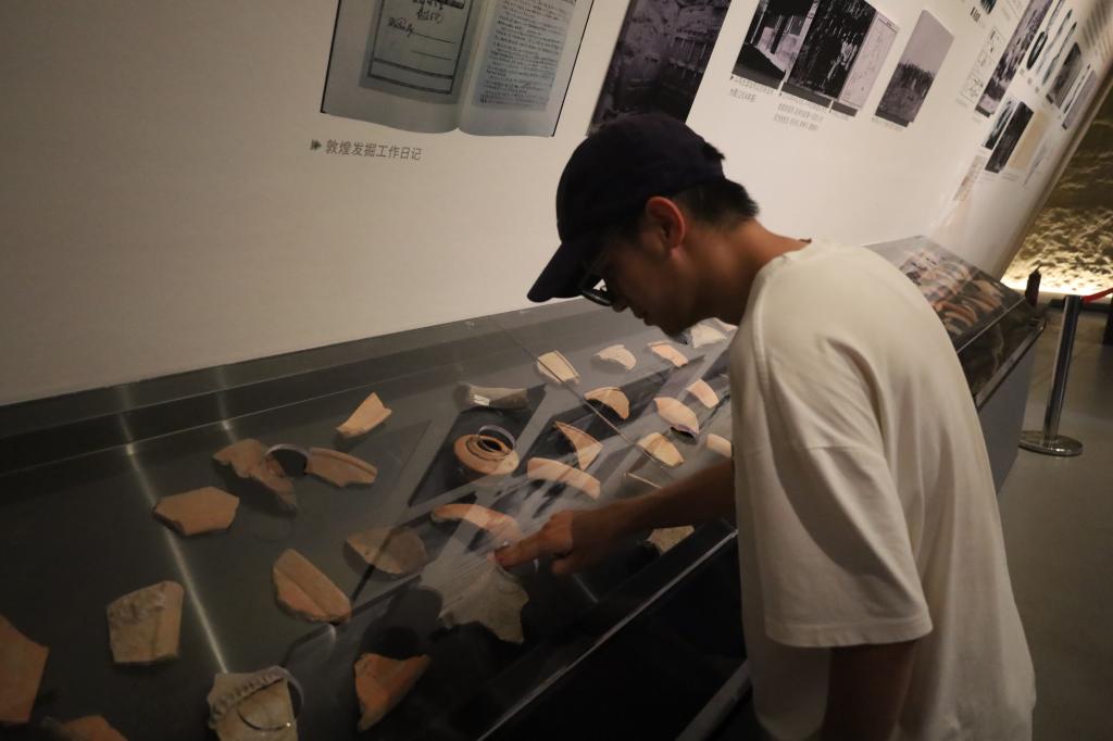 7月15日,实践团来到仰韶文化博物馆遗址公园。作为黄河中游新石器时代文化的典型代表,仰韶文化以彩陶闻名。队员们首先参观博物馆内的彩陶展品,隔着展柜玻璃仔细观察人面鱼纹盆、小口尖底瓶等器物的纹样布局与烧制痕迹,通过分组讨论,归纳不同时期彩陶从简单条纹到复杂图案的风格演变。随后,在遗址公园的模拟考古区,队员们化身“考古工作者”,参与“探方发掘”实践:划定1平方米探方范围后,手持小铲、毛刷等工具逐层清理表层土,严格遵循“由上至下、由外及内”的原则操作,切身感受考古发掘的严谨流程。当“出土”零碎陶片标本后,大家围坐在一起尝试拼接碎片,在反复比对中学习器物修复的基础方法。