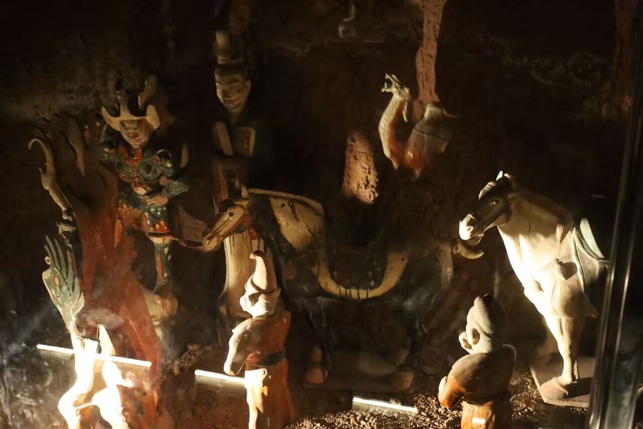 洛阳古墓博物馆坐落于邙山之巅,这里自古有“生在苏杭,死葬北邙”的说法,埋藏着东周至明清时期的数千座古墓。在博物馆讲解员的带领下,实践队员们首先步入地下展厅——这里复原了25座历代典型墓葬,从战国时期的“天子驾六”车马坑到唐代的彩绘陶俑群,从宋代的砖雕壁画墓到明清的家族合葬墓,犹如一条穿越时空的“地下长廊”。