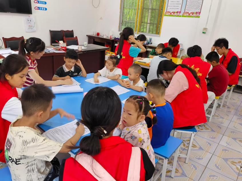 另一部分队员走进“童伴之家”,开启学业辅导环节。在这里,队员们围在孩子身边,针对数学难题耐心拆解步骤,帮语文学习有困难的孩子梳理写作思路,从一道题的解法到一篇作文的打磨,用心助力孩子巩固知识基础,让辅导既有温度又有实效 。