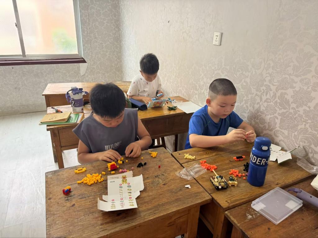 在创意搭建环节,有的孩童专注拼出“超级战车”,有的精心搭建“梦幻城堡”。实践队员们在旁轻声交流,夸赞独特设计——“这个战车的彩色轮子太酷啦,像会发光的宝石”“城堡上的小花装饰,让它变成了花仙子的家” 。通过这样的互动,守护孩童的创意天性,让益智搭建不仅是动手实践,更是创意启蒙,为社区教育服务注入活力。