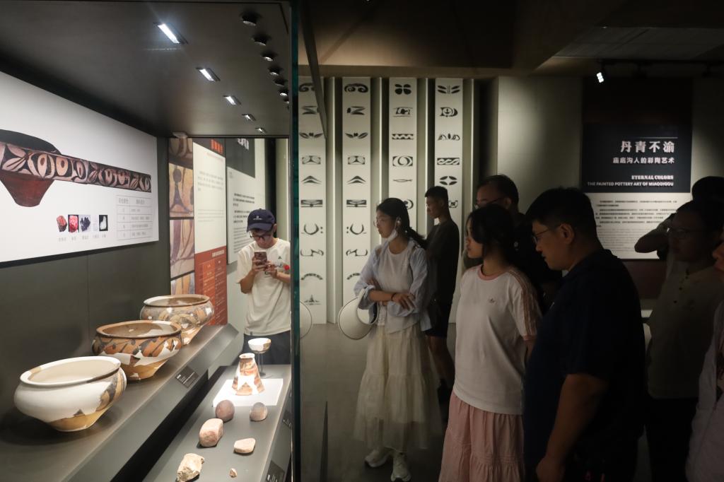 展品互动:触摸六千年前的文明印记 在“百卉含英,花萼相辉”展区,一件月牙纹彩陶罐引得众人驻足。透过展柜先进的低反射玻璃,陶罐上的纹饰清晰如新,仿佛能看见先民绘制时的专注。研学者们通过多媒体互动屏,了解彩陶纹饰的演变过程,并尝试在虚拟平台上绘制简单的花瓣纹,体验古人艺术创作的乐趣。以前总觉得彩陶只是普通的陶器,但在这里,通过互动展示和导师讲解,才明白这些纹饰不仅是装饰,更是早期先民对自然与生命的理解。