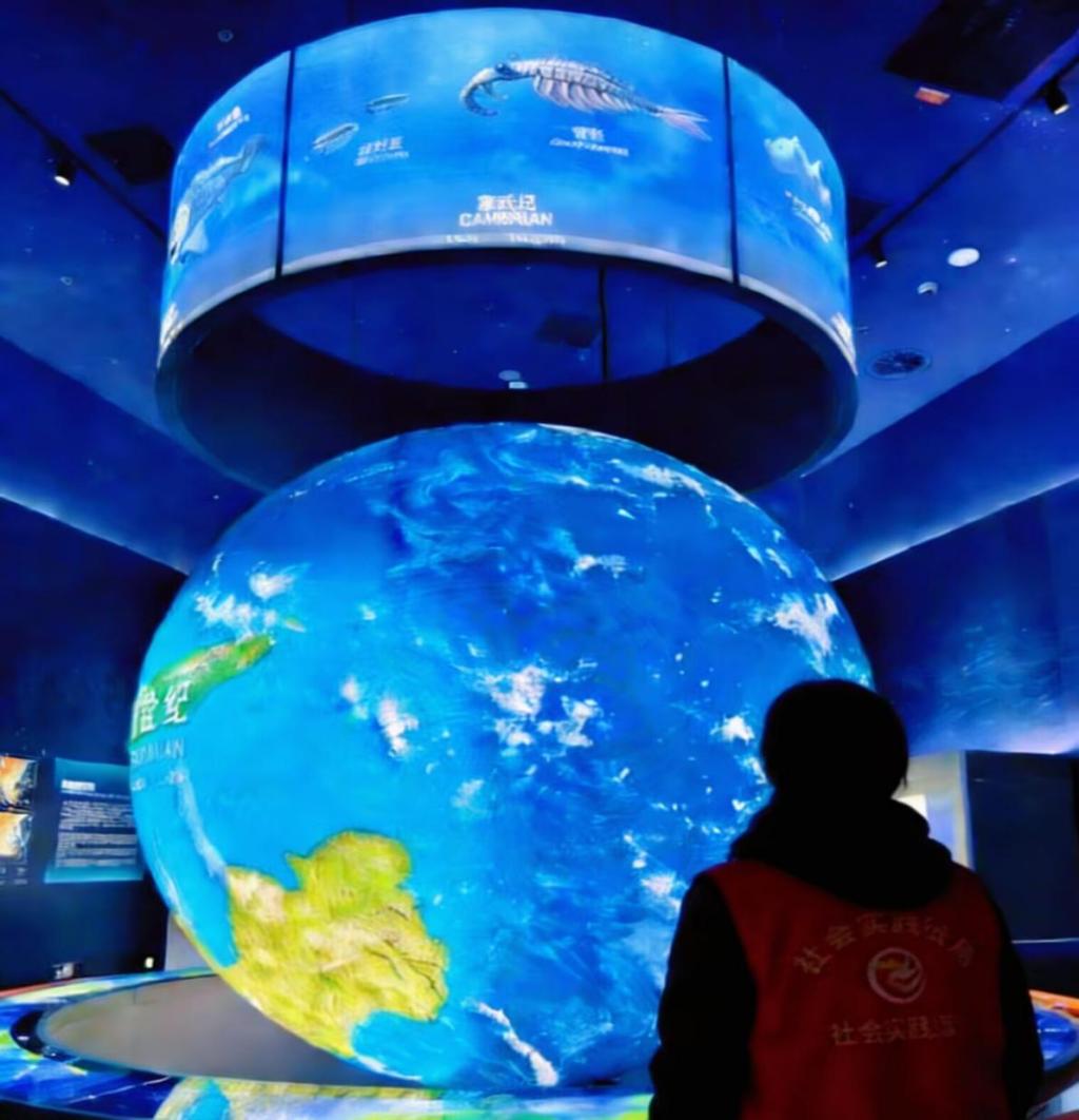 步入地球演化展厅,巨大的球形数字沙盘循环播放着从寒武纪到当代的生命演化历程,实践队员们围绕沙盘展开了跨学科研讨。他们结合展区提供的地质数据与生物演化资料,分析地球生态系统变迁与人类科技发展的关联,探讨如何通过科技创新应对气候变化等全球性挑战。实践队员们以“科技赋能生态保护”为主题,分组设计了乡村产业绿色升级的初步方案:有的队员提出利用物联网技术搭建农田监测系统,有的队员设想通过生物降解材料改良乡村土壤,尝试将科技馆所学的前沿技术与乡村实际需求相结合,形成兼具创新性与可行性的实践思路。