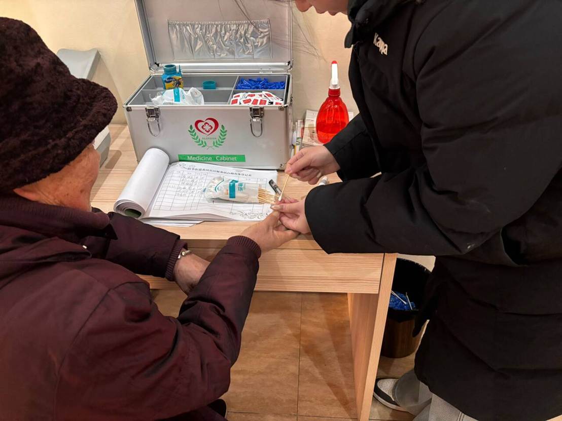 黄河社区是典型的老龄化社区,60岁以上居民占比超30%,多数高龄老人患有慢性病且行动不便。为确保每一位有需求的老人都能享受到服务,实践队成员采用“上门服务+定点检测”双轨并行的方式。在社区工作人员的带领下,实践队成员带着血糖仪、采血针、消毒棉片等专业设备,走进独居、空巢老人的家中。检测时,严格遵守操作规范,从消毒指尖、精准采血,到读取数值、详细记录,每一步都细致入微。实践队成员还会耐心询问老人的日常饮食与作息,用通俗易懂的语言讲解血糖数值代表的健康状况。温暖的互动让原本冰冷的检测现场处处洋溢着温情。