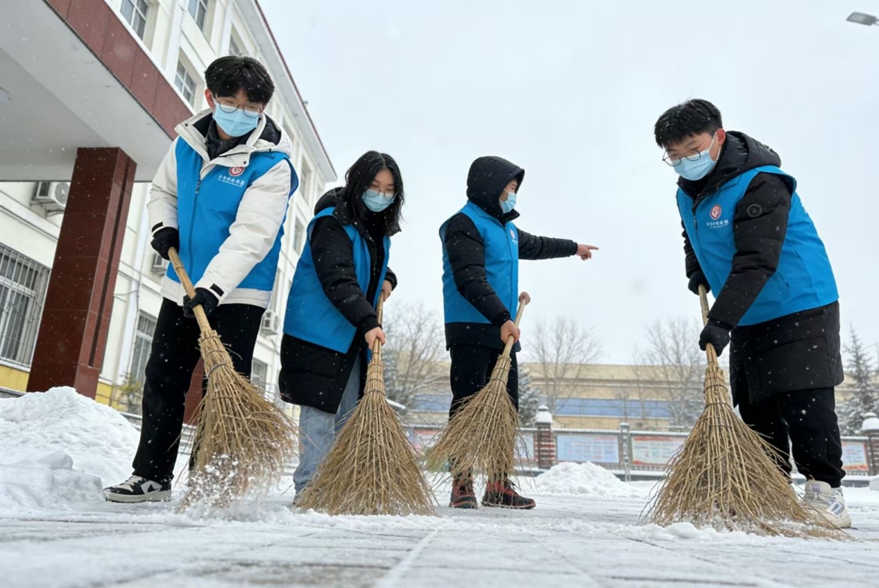 实践队活动期间恰逢降雪,为确保校园道路畅通和师生出行安全,实践队主动承担了校园主干道及主要活动区域的扫雪铲冰任务。他们借鉴了高校常见的扫雪工作方案,成立了临时工作小组,进行了明确的分工。星火传薪实践队成员迅速集结,主动对接学校后勤部门,领取扫帚、铁锨等清扫工具,明确分工后立即投入扫雪工作。队员们以班级原卫生区域为基础,延伸至校园主干道、教学楼门口、食堂周边等人员密集区域,两人一组、三人一队,默契配合开展清扫。部分队员负责使用校方提供的铲雪工具清理路面积雪,另一部分队员则在教学楼入口、台阶等易滑路段铺设防滑垫或纸板,并设置安全提示。整个扫雪过程组织有序,高效完成了预定区域的清理工作有的弯腰铲除路面薄冰,有的挥动扫帚清理积雪,有的将清扫后的积雪有序堆放至绿化带边缘,避免影响通行。过程中,队员们始终保持高效务实的作风,不顾天气寒冷,坚守清扫岗位,不放过任何一处积雪死角。经过近两小时的奋战,校园核心区域积雪全部清理完毕,为师生开辟出安全通畅的出行道路,得到在校师生及学校工作人员的认可。