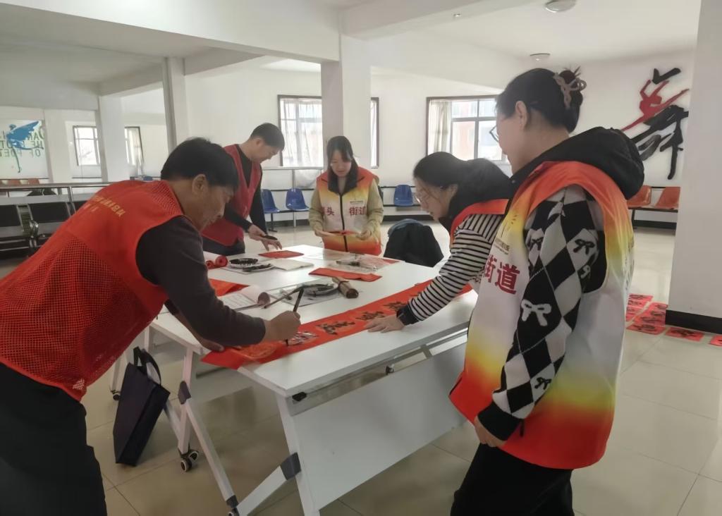 “天增岁月人增寿,春满乾坤福满门”“平安如意千般好,富贵吉祥万事兴”,一幅幅寓意吉祥的春联跃然纸上,苍劲有力的行楷、飘逸洒脱的行书搭配喜庆的红纸,让传统文字焕发别样生机。实践小组的同学们各司其职、忙而有序:有的稳稳扶纸,配合书法爱好者调整书写角度;有的细心协助晾干墨迹,避免春联受损;有的主动为居民递送写好的春联与福字,耐心询问需求。来自社区的李大爷接过刚晾干的 “福” 字,脸上满是笑容:“手写的春联就是不一样,有温度、有墨香,贴在家里才叫过年,这才是咱们中国人的年味儿!”