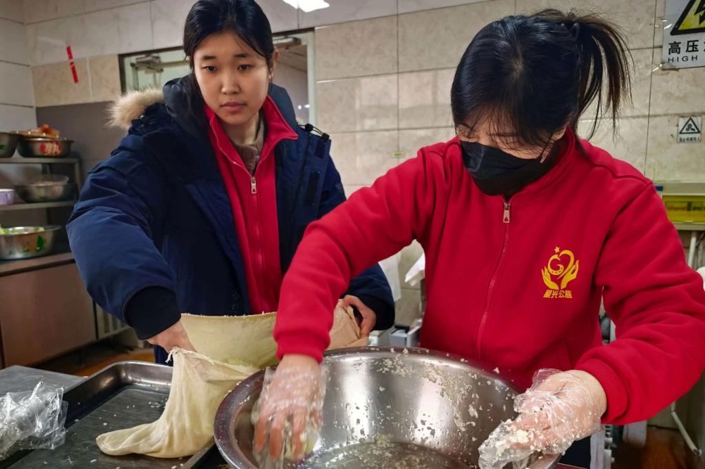 与此同时,另一部分队员在厨房协助工作人员煮饺子。随着一锅锅热气腾腾的饺子出锅,浓郁的香味弥漫在整个餐厅。队员们小心翼翼地将饺子盛到碗里,根据老人们的食量适量分配,然后端到每位老人面前,贴心地提醒他们 “慢慢吃,小心烫”。老人们品尝着鲜香可口的饺子,脸上露出了欣慰的笑容,纷纷称赞:“这饺子味道真好,比家里包的还香!”