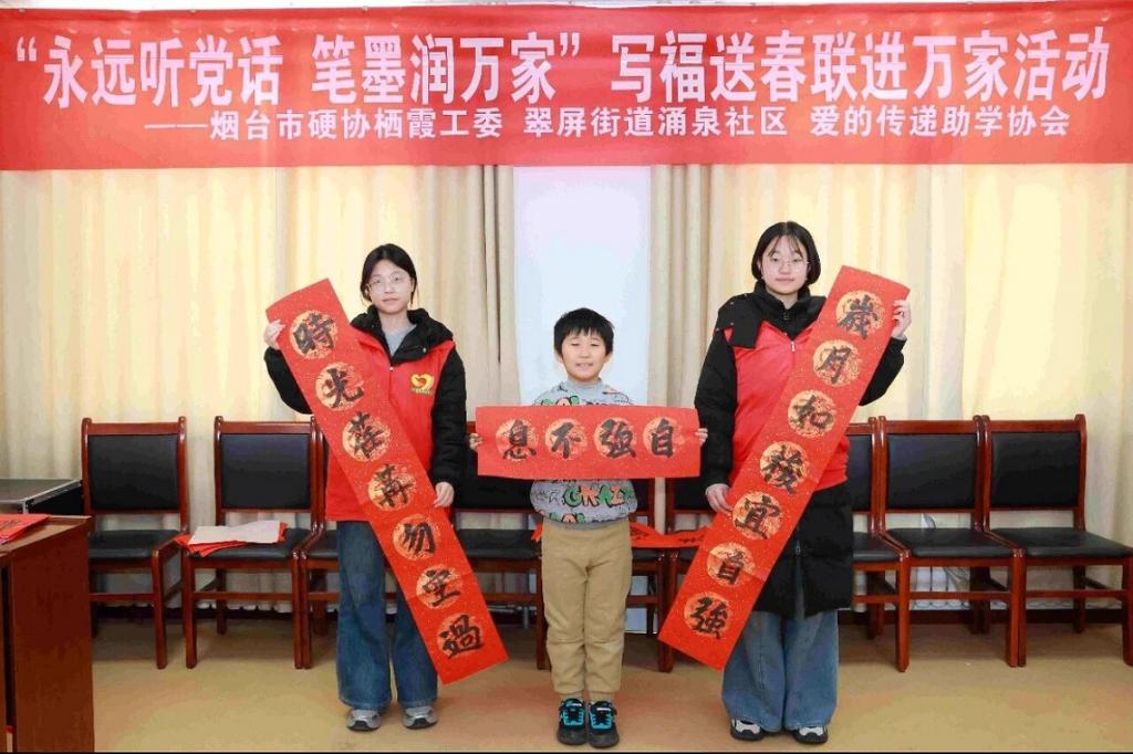 新春将至,年味渐浓,为传承中华优秀传统文化,营造欢乐祥和的新春氛围,快猫视频 “河韵承千古 青衿履新程”社会实践队于2026年2月6日走进栖霞市涌泉社区,联合烟台市硬笔书法家协会栖霞工委共同举办“永远听党话,笔墨润万家”写福送春联进万家主题文化志愿服务活动。实践队员以笔墨为媒,与书法家、社区青少年同台挥毫,开展教学互动、送福入户等实践活动,将新春祝福与文化暖意送到社区群众身边,用青春力量让传统年俗在基层焕发光彩。
