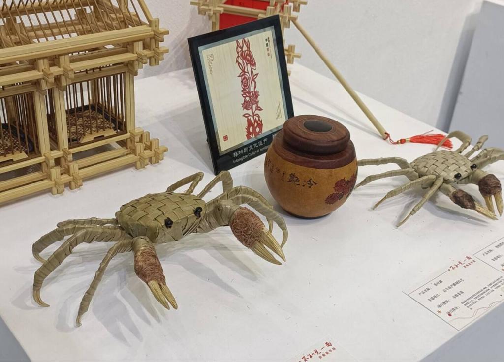 在黄河入海口这片河海交汇的土地上,独特的湿地生态孕育了丰富的黄河文化,它们既是当地百姓生活智慧的结晶,也是黄河文化的鲜活载体。实践队员进一步走访了东营市美术馆,苇编螃蟹的精巧造型首先吸引了目光。这些以黄河口湿地芦苇为原料编织而成的作品,不仅形态逼真,更承载着当地渔业文化的记忆。苇编技艺从选料、破篾到编织,每一道工序都依赖手工完成,而芦苇作为湿地生态的重要组成部分,其可持续采收也成为非遗与生态保护协同发展的关键。手扎灯笼则以竹篾和芦苇为骨架,传统的榫卯结构与民俗纹样,让这件节庆用品成为黄河口民俗文化的缩影,其制作过程中对本土材料的依赖,更体现了人与自然的和谐共生。