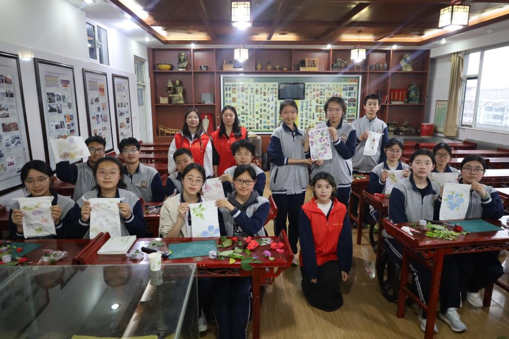 课堂上,志愿者从植物选择、构图布局到拓印技巧逐步讲解演示。同学们认真摆放叶与花,轻轻敲击,随着此起彼落的捶打声,植物的脉络与色彩渐渐清晰地浮现于素布之上,仿佛将春天永远留存。制作过程中,志愿者穿行其间,耐心指导拓印力度与画面构图,在互动中传递技艺之美。