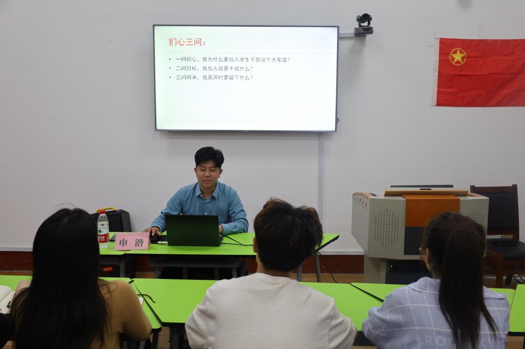 会议伊始,主持人王瑾对申潜的到来表示热烈欢迎。申潜以经验分享为主题,回顾了他的学生时期心路历程,分享了学生会工作经验,并引导学生树立青年义务,坚定自己的理想信念并为之努力拼搏。随后,他强调学习和读书是通往成功的途径。他与同学们分享一些优秀校友案例和优秀书籍,给同学们提供了学习借鉴的榜样。最后,申潜为学生解答了有关学生时代学生和工作的难题,并鼓励大家勇于充实自我、挑战自我,努力探求更广阔的天地。