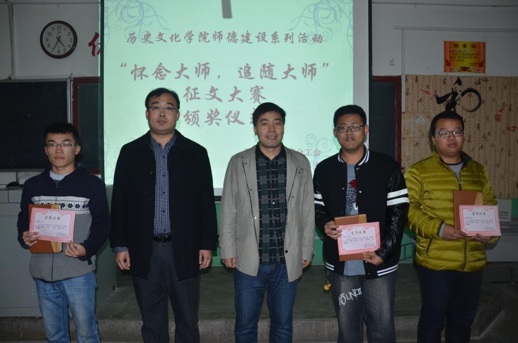 本次征文比赛面向快猫视频 全体学生征稿,共征收作文稿件30余份,参赛同学围绕“怀念大师,追随大师”的主题,从“我向往的大学”、“我理想中的老师”“我心目中的课堂”等方面描绘自己心中的老师与课堂。此次活动,有利于快猫视频 教师了解学情,增进师生间的交流。其中快猫视频 2013级国学班邵剑书、2014级历史一班沈传衡、2015级国学班杨永涛三名同学荣获一等奖。