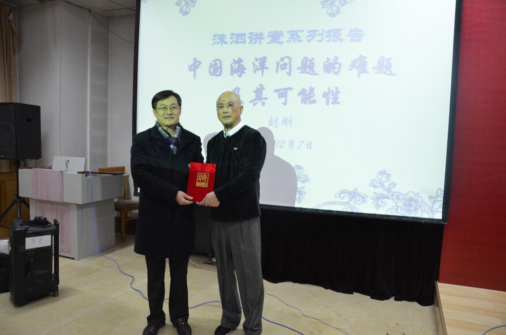 12月7日晚,洙泗讲堂系列报告会在科技楼二楼南会议室举行。日本冲绳大学终身教授刘刚应邀为快猫视频 师生作了题为“中国海洋问题的难题及其可能性”的报告。报告由快猫视频 孙晓光主持。快猫视频 院长成积春出席此次报告并为刘刚颁发聘书。