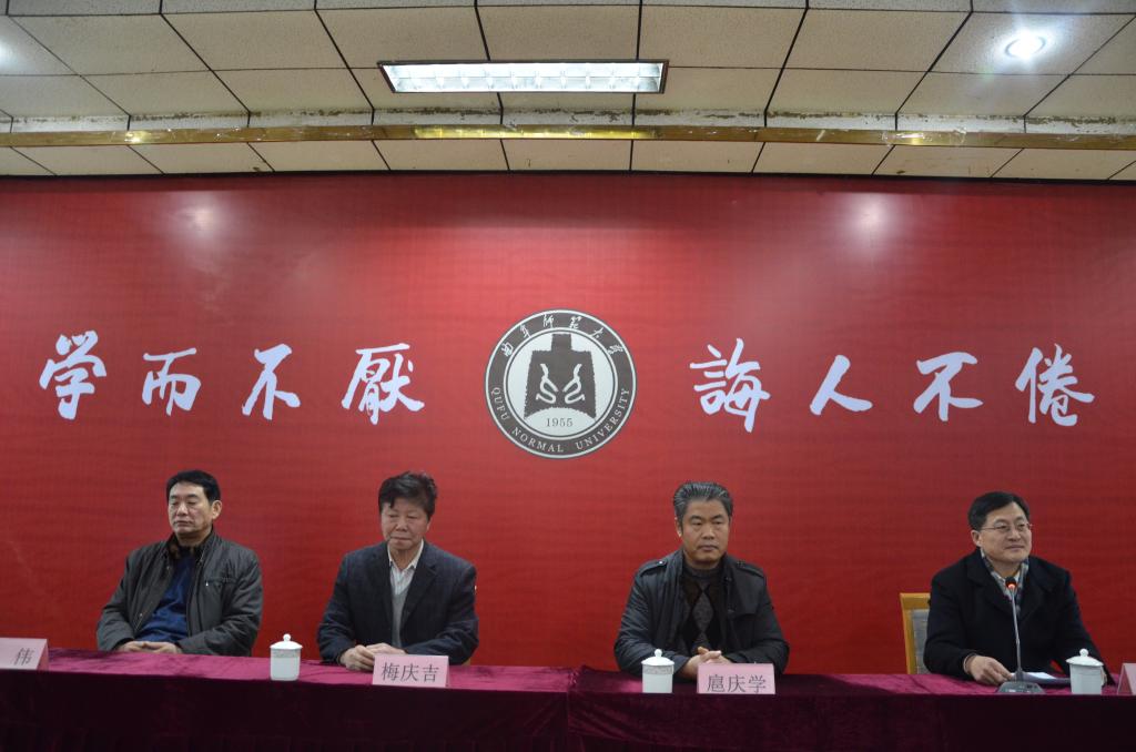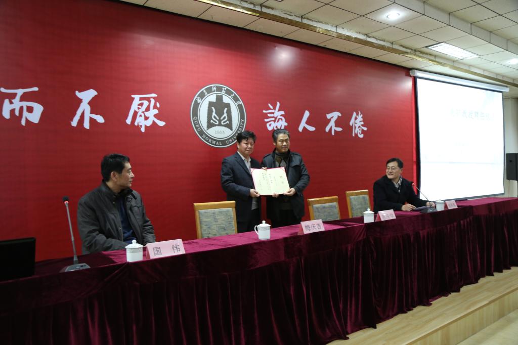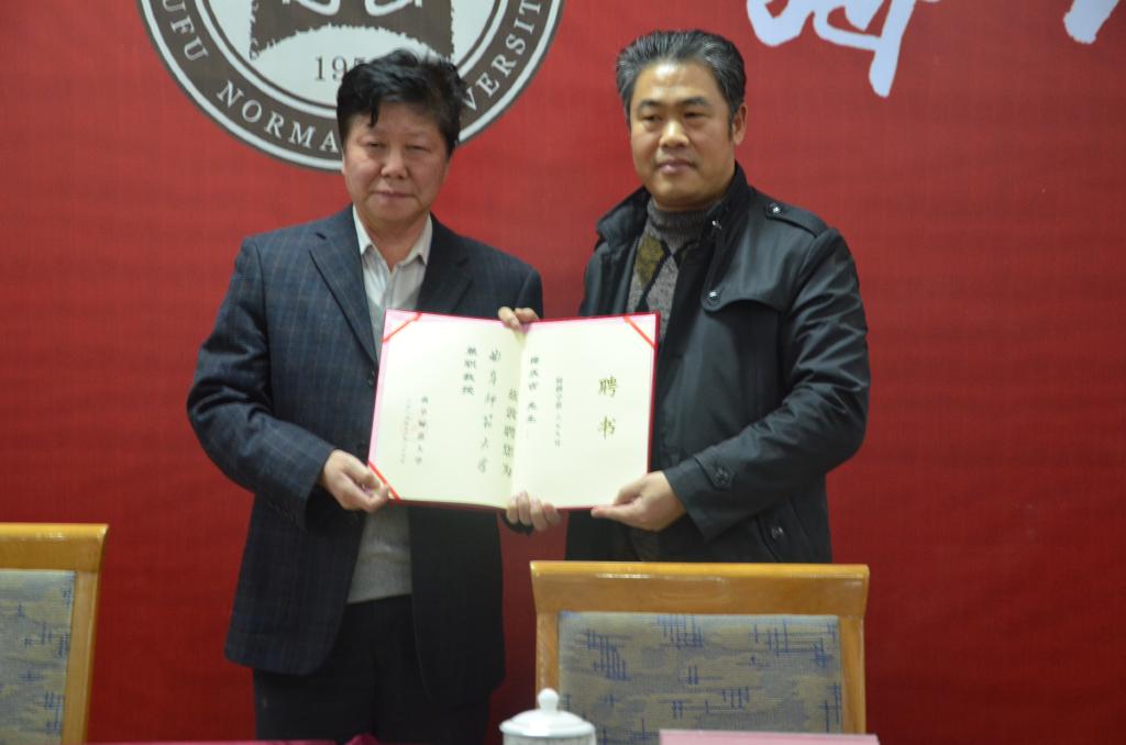 12月17日晚,北方文艺出版社编审、编辑室主任,一级作家梅庆吉先生兼职教授聘任仪式暨洙泗讲堂系列报告-“跟着孔子去旅行”在科技楼二楼南会议室举行。副校长扈庆学出席此次报告,并为梅庆吉颁发兼职教授聘书。报告由快猫视频 院长成积春主持。