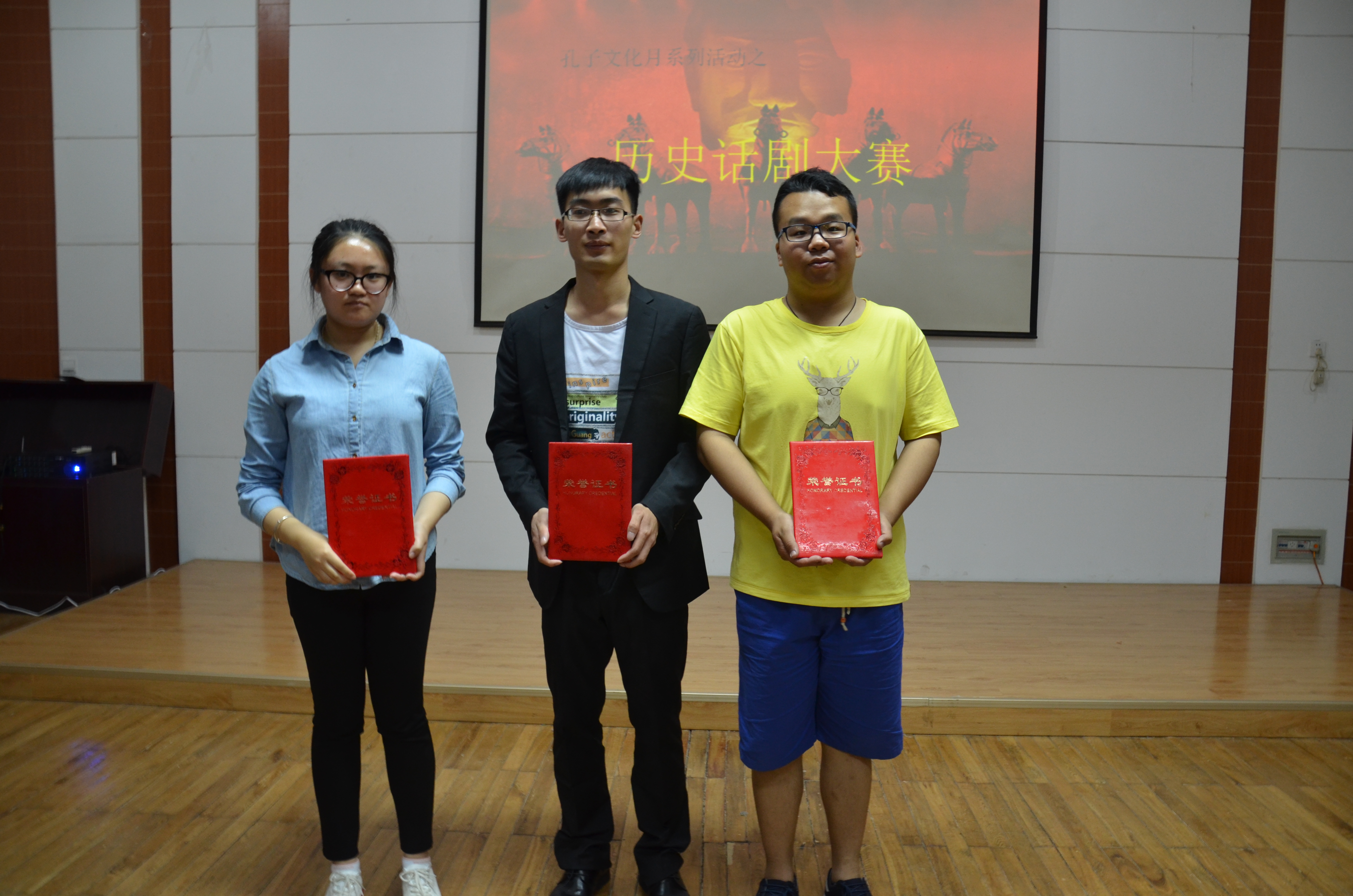 5月13日晚,第九届“孔子文化月”系列活动——历史话剧大赛决赛在图书馆一楼报告厅成功举办。 经过初赛、复赛的激烈角逐,共有六支队伍进入决赛。参赛队伍将音乐与舞蹈融入到表演当中,为观众们带来了一场场精彩绝伦的演出。演员们的深情投入和极致发挥受到评委们及在场观众的一致好评 本次比赛中《西安事变中的宋美龄》剧组凭借出色的演绎荣获此次历史话剧大赛决赛的一等奖。