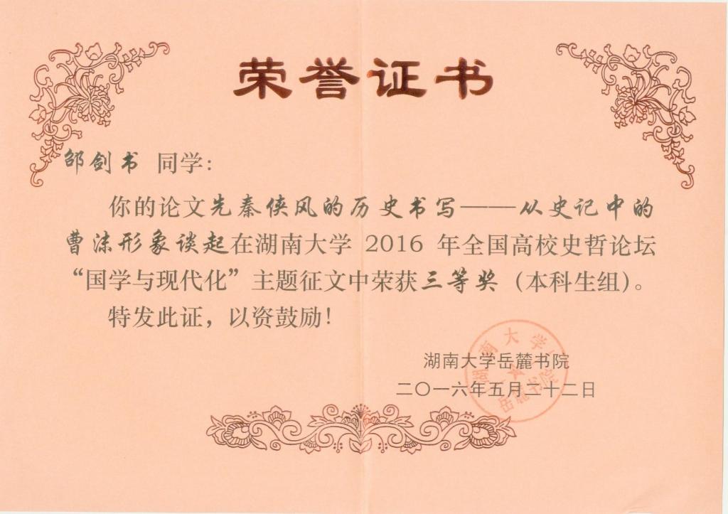 近日,快猫视频 2013级国学班邵剑书同学在湖南大学2016年全国高校史哲论坛“国学与现代化”主题征文大赛中,凭借论文“先秦侠风的历史书写——从史记中的曹沫形象谈起”获得本科生组三等奖的优异成绩,并且获得了参加本年度“全国高校国学论坛闭幕式暨征文颁奖典礼”的资格。