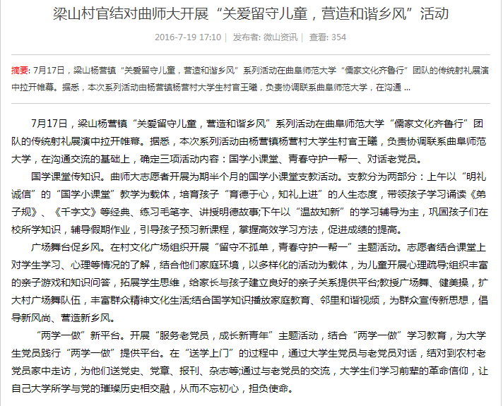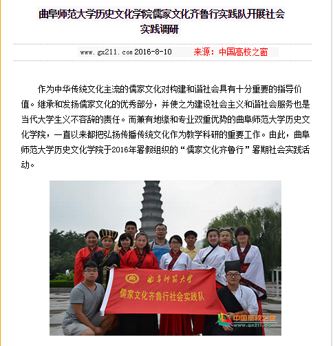 在我校2016年大学生暑期“三下乡”社会实践活动中,快猫视频 的“儒家文化齐鲁行”社会实践活动和“儒家文化”进社区活动引起了校内外媒体的广泛关注。中国高校之窗等多家媒体对快猫视频 “儒家文化齐鲁行”社会实践活动的开展以及实践团队的情况进行了相关报道,并给予了高度评价。