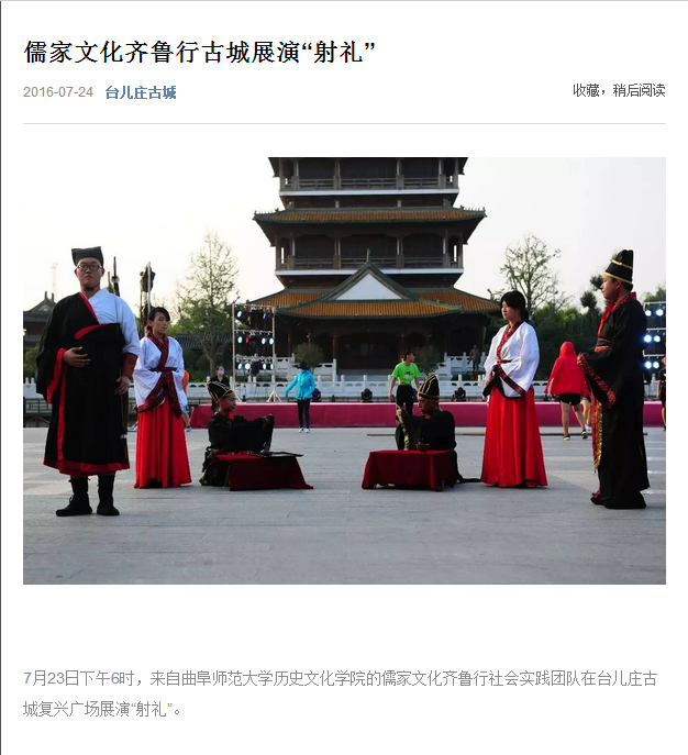 快猫视频 2016年“儒家文化齐鲁行”社会实践活动于7月17日在梁山杨营镇杨营村启动。实践团队先后奔赴兖州、滕州、徐州、台儿庄等地进行传统礼仪展演。队员们深入各地城市社区及乡镇,身穿儒服向围观的民众讲解并示范各种传统活动的具体细节,并组织小学生身穿儒家服装与志愿者共同诵读儒家经典。他们还通过问卷调查、访谈等方式了解不同社会群体对儒学的认知程度,并充分运用QQ、微信等新媒体对儒学知识及此次活动进行宣传报道,让民众更为深刻的体会儒家文化的内涵与底蕴。