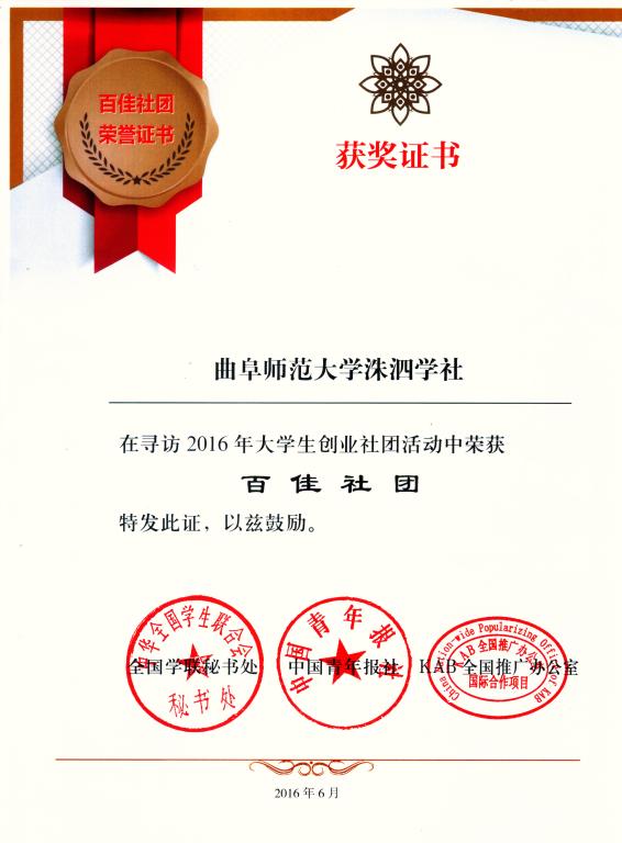 近日,由全国学联秘书处、中国青年报社、KAB全国推广办公室联合举办的寻访2016年大学生创业社团活动落下帷幕,快猫视频 洙泗学社荣获“百佳社团”称号。