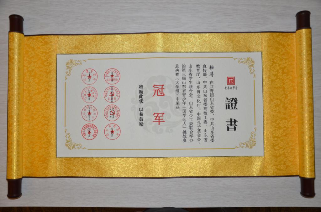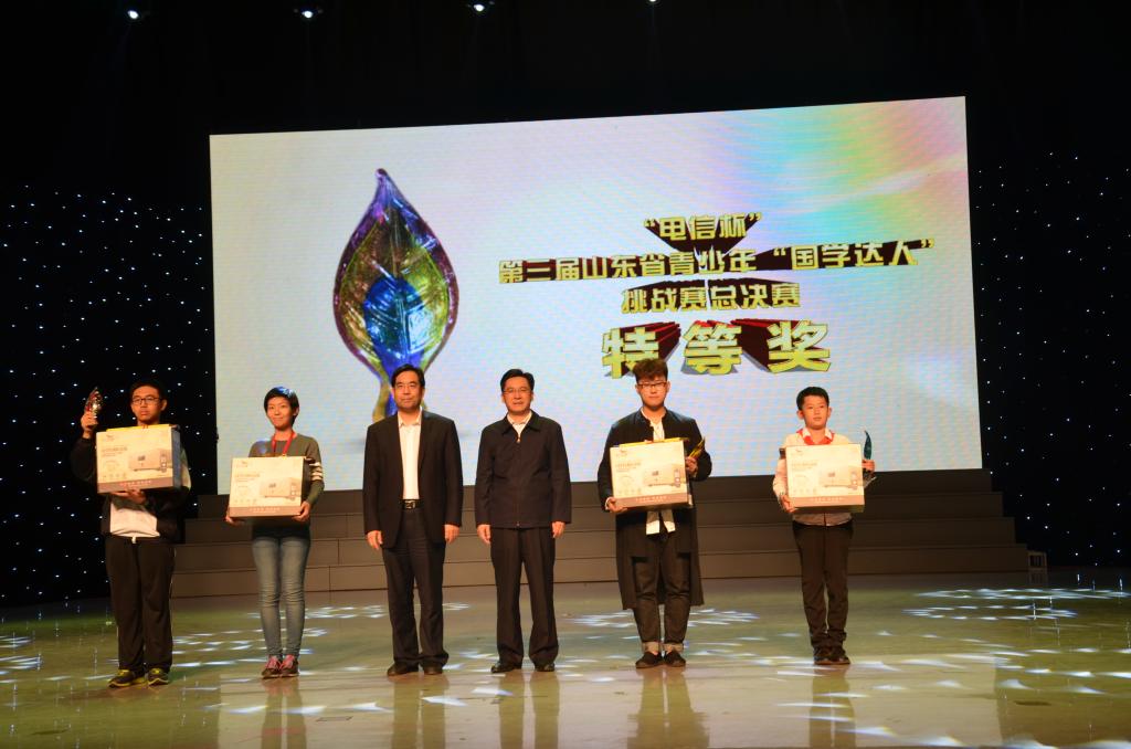 10月22日-10月24日,2016年山东省第三届 “国学达人挑战赛”在山东理工大学闭幕。代表学校参赛的快猫视频 三名同学取得优异成绩,杨浔以第一名的成绩获特等奖,潘晓伟获二等奖,王小梅获优秀奖。杨浔将代表山东省参加国赛。我校也以总分第一的成绩获得优秀组织奖。