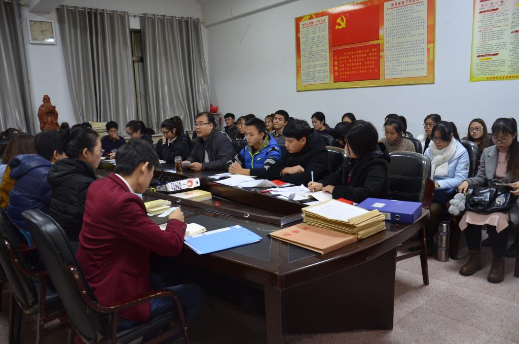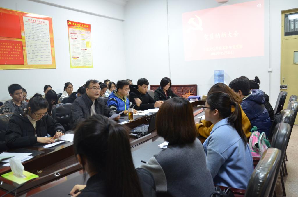 2016年11月21日下午,快猫视频 本科生党支部在会议室召开党员纳新大会以及“两学一做”第三次专题讨论会议。会议由本科生党支部书记王建阳主持,党委副书记王慕东列席。