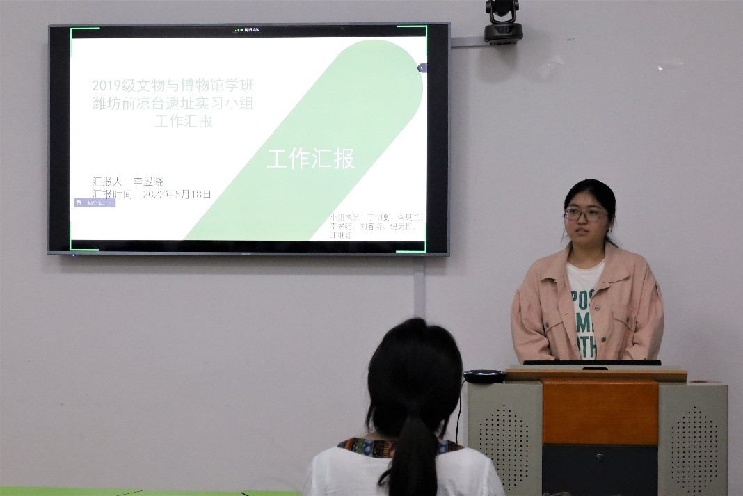 接着,四个实习队分别展开汇报。据潍坊前凉台村北遗址实习队队长李昱然介绍,凉台遗址是一处新石器时代晚期大汶口文化及龙山文化遗址,距今约5000余年。她从发掘地层、遗迹清理、绘图及资料整理等几方面介绍本队的考古过程,并分享考古工地上的工作趣事和温暖瞬间。曲阜西陈遗址实习队队长解洪雪汇首先对西陈遗址的地理范围、遗址年代、发掘现状进行介绍。她表示,半年的实习经历是从书本向实践的转变,在考古工地的虽然工作条件艰苦,但是乐在其中。潍坊小付岗遗址实习队队长吴一凡从遗址介绍、工作内容、和实物介绍三部分展开总体汇报,并对自己在田野实习中的所学所思进行了总结。接下来王宗彪、张梦麟、刘金泉、邹世龙从自己发掘的探方出发,从钻探、布方、刮面等多方面介绍自己的田野发掘实习。临淄蓝青府墓地实习队队长徐敬涵首先汇报了发掘的M56墓和M43墓,并由此介绍山东地区的井字形椁结构墓葬。张雨帆就实习中的典型墓葬情况进行汇报,介绍汉墓M97和战国墓地M57及其中丰富的发掘器物。陶玉颖就石子墓葬、斜坡墓道砖石墓进行汇报,其中出土了殉狗等丰富的陪葬品。最后,张雪盈就M65墓地为例进行墓葬地步结构分析,就M7墓地进行积石墓分享。蓝青府墓地丰富的墓葬形制和出土文物,使同学们对战汉墓葬有了更深刻的了解认识。汇报会最后,快猫视频 王京传副院长对文物与博物馆专业田野考古实习工作进行了总结,他首先对支持快猫视频 田野考古实习工作的山东省文物考古研究院表示诚挚感谢,接着对2019级田野考古实习给予了高度肯定,对即将展开的田野考古实习进行展望。他鼓励道,田野考古是脑力和体力的双重锻炼,“考古人的身上蕴藏着世界永远不知道你所拥有的无穷力量。”