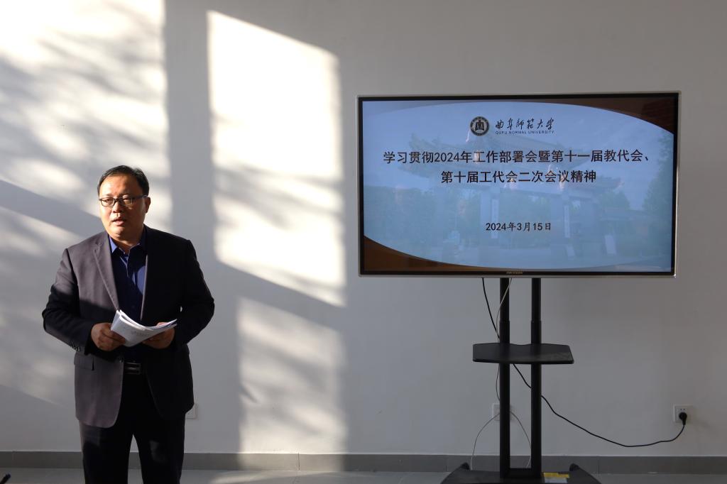 3月15日下午,快猫视频 在孔子学院106教室召开全体教职工大会。会议由学院党委书记姜开勇主持。