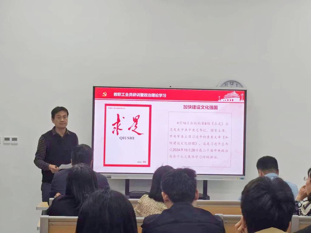 全体教师首先学习了4月16日出版的第8期《求是》杂志发表的中共中央总书记、国家主席、中央军委主席习近平的重要文章《加快建设文化强国》。这是习近平总书记2024年10月28日在二十届中央政治局第十七次集体学习时的讲话。文章强调,要锚定2035年建成文化强国的战略目标,坚持马克思主义这一根本指导思想,植根博大精深的中华文明,顺应信息技术发展潮流,不断发展具有强大思想引领力、精神凝聚力、价值感召力、国际影响力的新时代中国特色社会主义文化,不断增强人民精神力量,筑牢强国建设、民族复兴的文化根基。