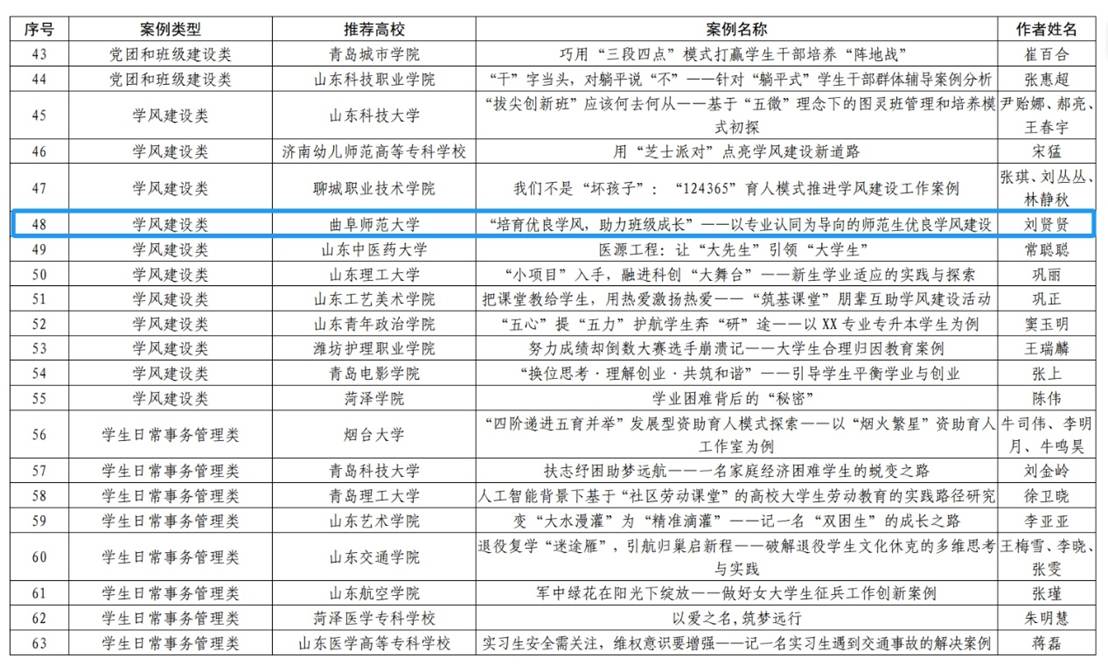 近日,中共山东省委教育工委公布2024年全省高校辅导员工作创新项目评选结果,快猫视频 辅导员刘贤贤的学风建设类工作优秀案例《“培育优良学风,助力班级成长”——以专业认同为导向的师范生优良学风建设》荣获三等奖。