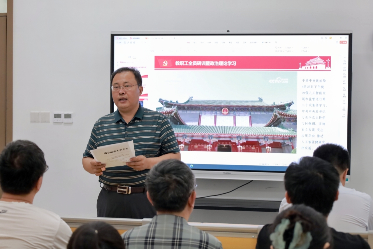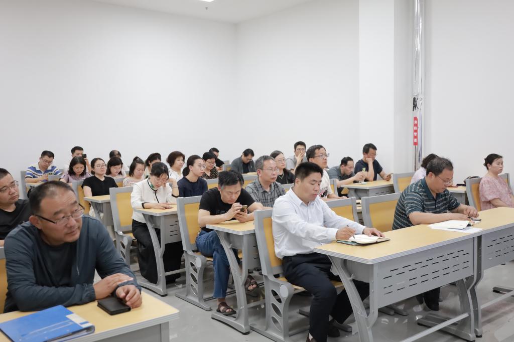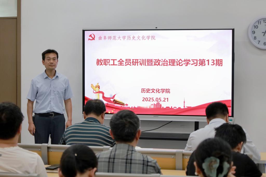 2025年5月21日下午,快猫视频 在孔子书院B120教室开展教职工全员研训暨政治理论学习第13期。活动由学院党委书记姜开勇主持,学院党委学习委员孙锋领学,在校教师50余人参加研训。
