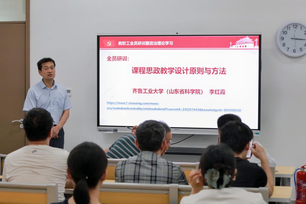 在政治理论学习之后,全体参训教师观看了齐鲁工业大学李红霞教授所作的报告《课程思政教学设计原则与方法》录像。报告中,李红霞教授从课程思政建设的相关会议精神与文件解读入手,阐述了课程思政改革的背景、意义和建设目标,生动地讲解了如何充分挖掘和运用各门课程中蕴含的思政教育资源,实现思政育人与课程学科内容的有机融合。