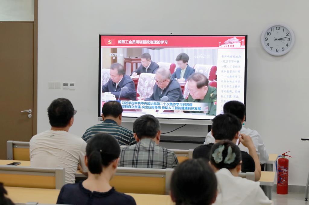 全体教师首先学习了习近平总书记在中共中央政治局会议及中共中央政治局第二十次集体学习时的重要讲话精神。中共中央政治局4月25日召开会议,分析研究当前经济形势和经济工作。会议指出,要坚持稳中求进工作总基调,完整准确全面贯彻新发展理念,加快构建新发展格局,统筹国内经济工作和国际经贸斗争,坚定不移办好自己的事,坚定不移扩大高水平对外开放,着力稳就业、稳企业、稳市场、稳预期,以高质量发展的确定性应对外部环境急剧变化的不确定性。中共中央政治局4月25日下午就加强人工智能发展和监管进行第二十次集体学习。中共中央总书记习近平在主持学习时强调,面对新一代人工智能技术快速演进的新形势,要充分发挥新型举国体制优势,坚持自立自强,突出应用导向,推动我国人工智能朝着有益、安全、公平方向健康有序发展。
