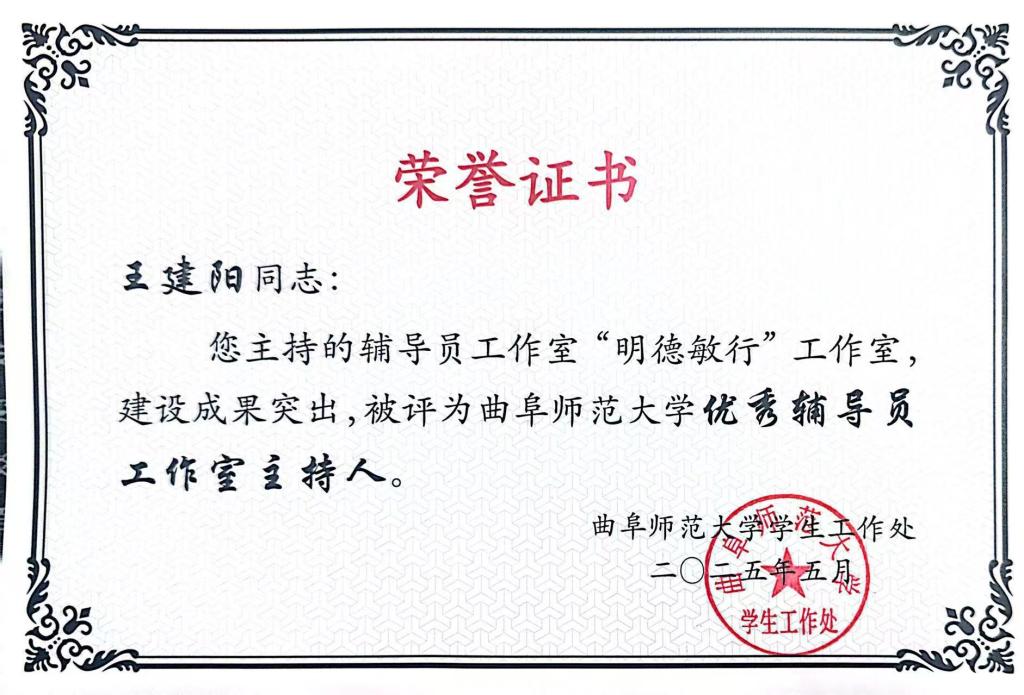 在2022年立项的首批8个校级辅导员工作室中,明德敏行辅导员工作室脱颖而出,顺利结项,主持人王建阳获评“优秀辅导员工作室主持人”(全校共3人)。该工作室以“中华优秀传统文化全方位育人”为核心,以“博雅君子培养计划”为主线,构建“博学、问礼、笃行”三位一体育人模式,打造“孔子文化月”“洙泗讲堂”“曲园有礼”“儒学经典大会”等品牌活动,将传统文化深度融入大学生培养全过程。工作室先后入选日照市首批高校辅导员名师工作室和全国高校辅导员工作室联建共建单位。