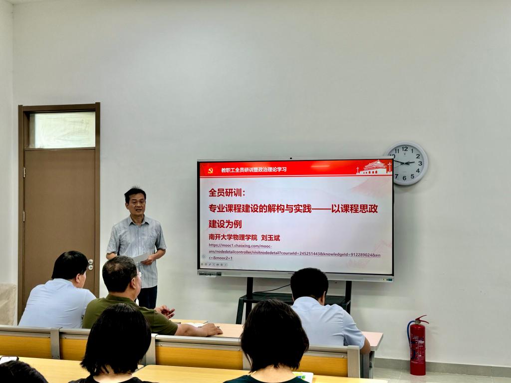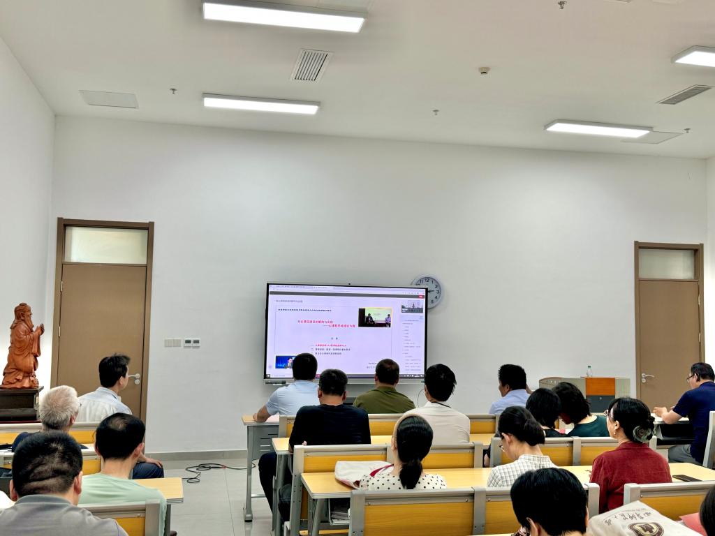 在随后进行的全员研训环节,与会人员共同观看了南开大学物理学院刘玉斌教授所作的《专业课程建设的结构与实践——以课程思政建设为例》的专题视频。刘玉斌教授结合自身丰富的教学经历与国家教育评价改革新要求,从课程思政V1.0到课程思政V2.0、课程思政:国家一流课程的基本要求、结合专业课程构建课程思政三个方面,深入探讨了新时代下如何深入推进高校课程思政建设这一问题,尤其强调应当结合专业课程群建设课程思政体系。