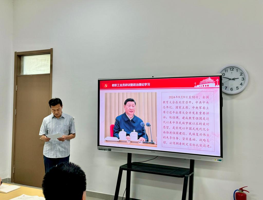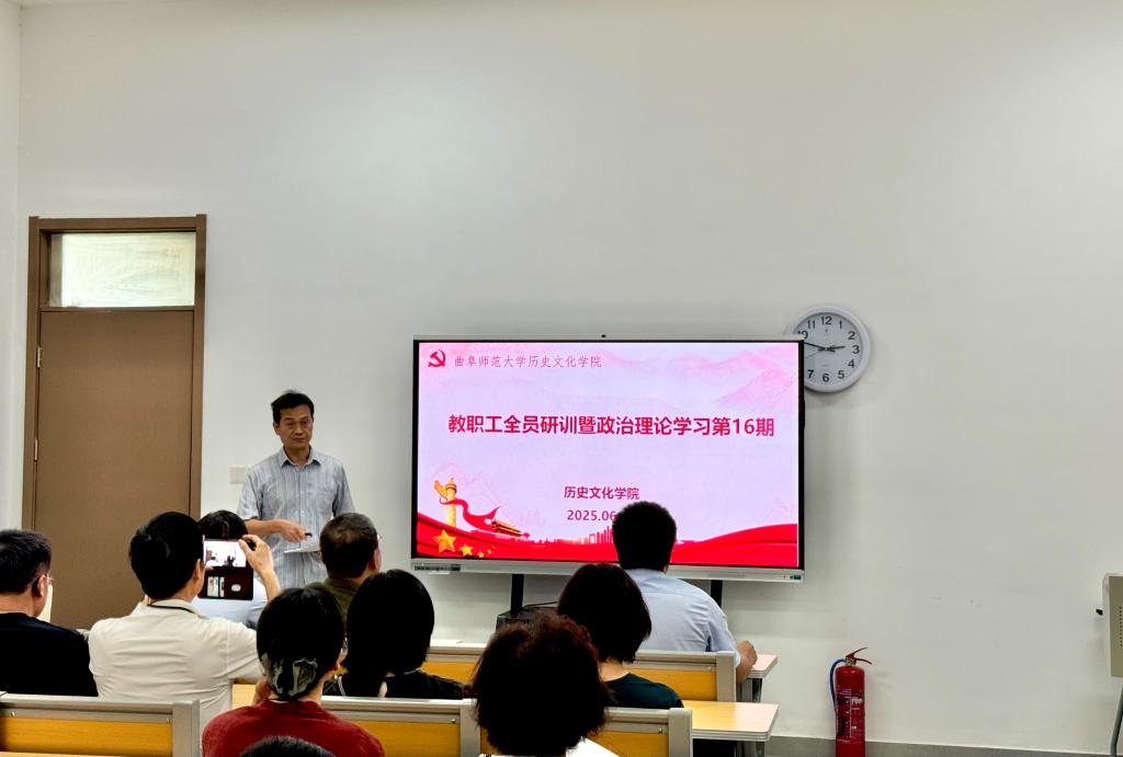 2025年6月11日下午,快猫视频 在孔子书院B120教室举行教职工全员研训暨政治理论学习第16期活动。活动由学院党委学习委员孙锋领学,近60名在校教师参加。