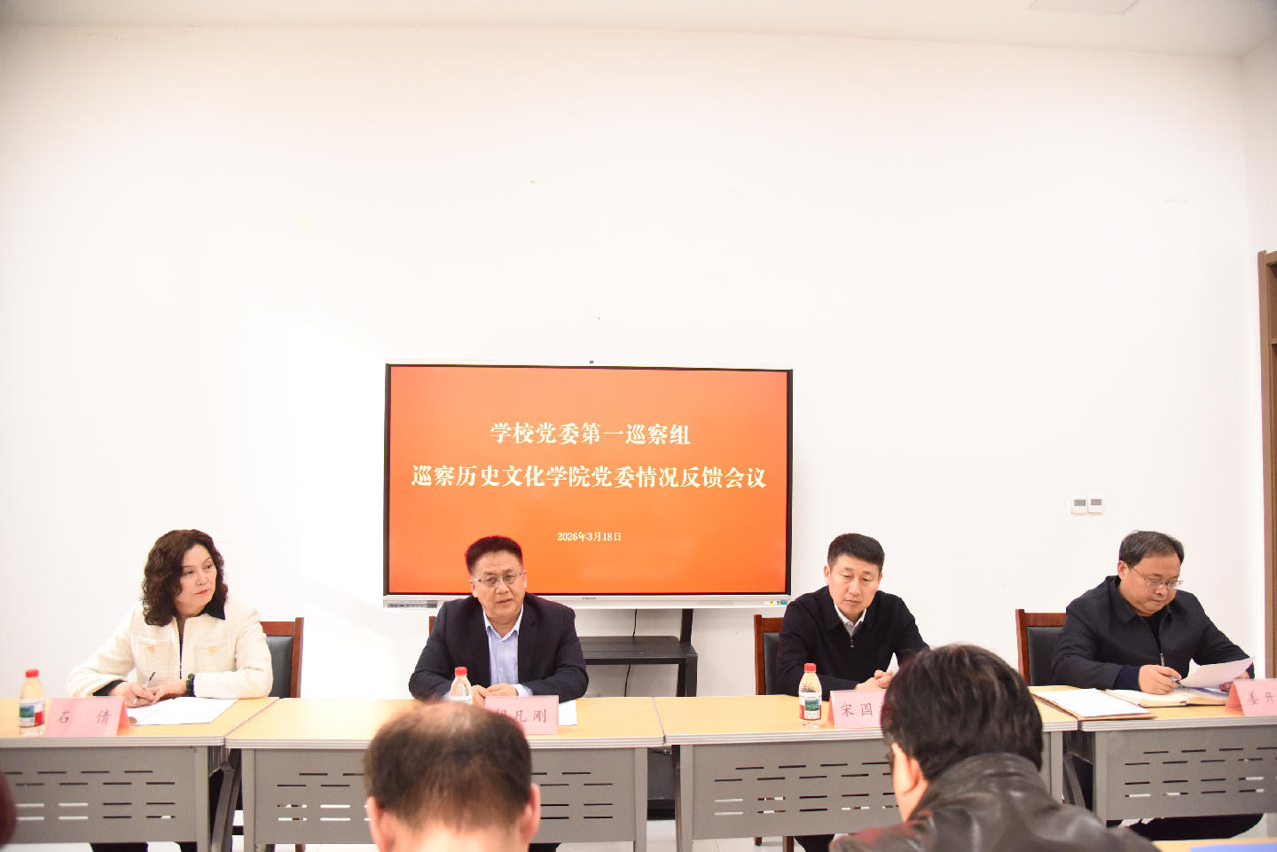 3月18日下午,学校党委第一巡察组向快猫视频 党委反馈巡察情况。学校党委常委、副校长胡凡刚,学校党委委员、党委巡察工作领导小组成员、党委办公室主任、巡察工作领导小组办公室主任宋国栋出席向学院领导班子反馈会议。会前,召开向学院主要负责人反馈会议,宋国栋传达校党委书记邢光在听取巡察工作汇报时的讲话精神,巡察组组长石倩通报巡察发现问题。学院党委书记姜开勇主持向领导班子反馈大会并作表态发言。